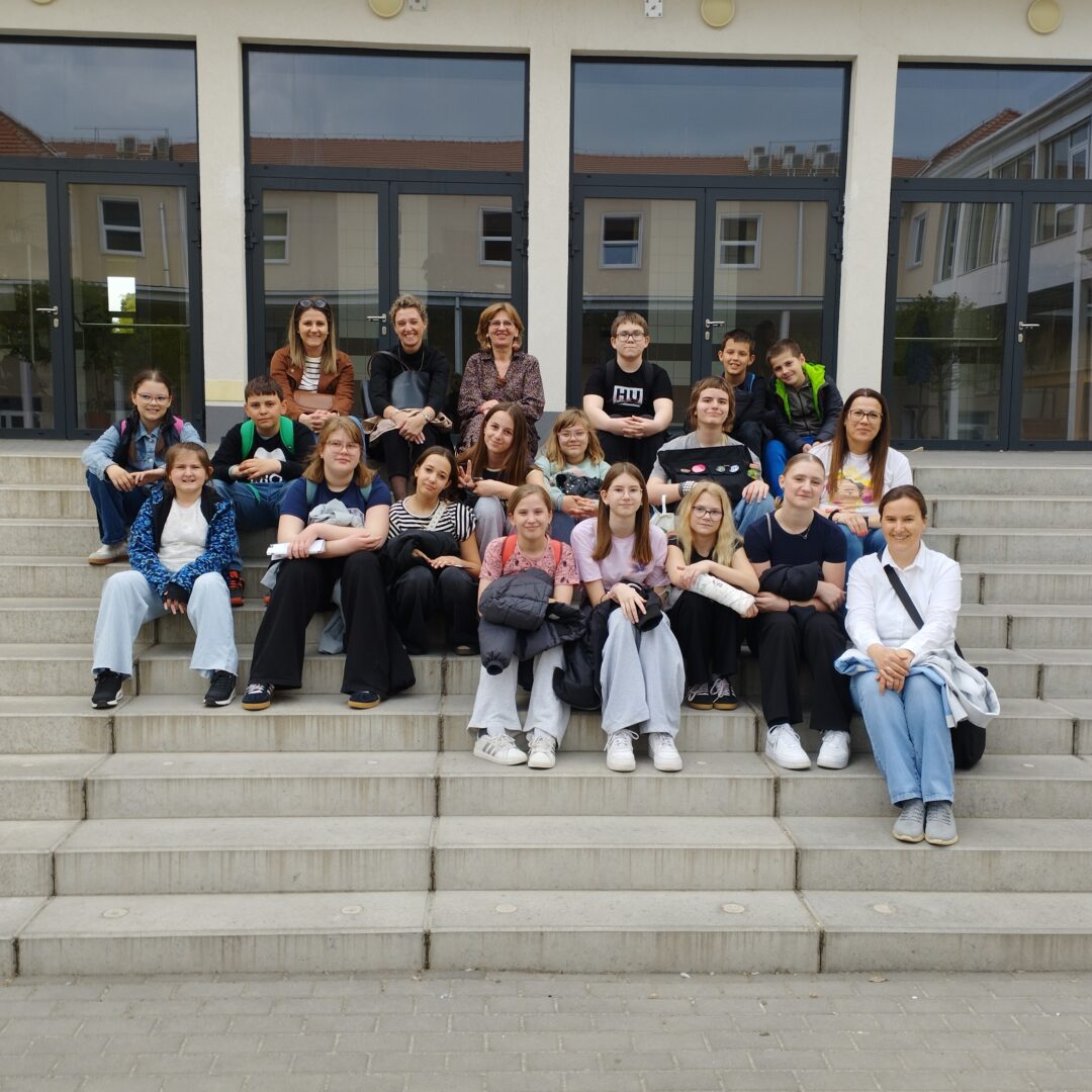 Vendégségben voltunk a mohácsi Széchenyi Általános Iskolában. Az iskolánk negyedikes és hatodikos diákjai utaztak, akik ápolják a magyar nyelvet, valamint Ivona Kučuk osztálytanító, Adriana Traic Horvat az iskolánk pedagógusa és Jager Brigitta tanárnő.