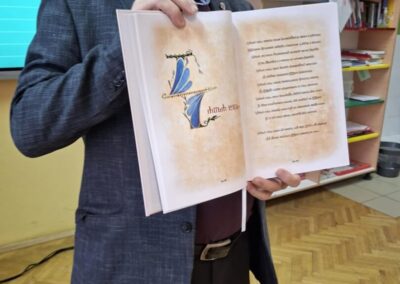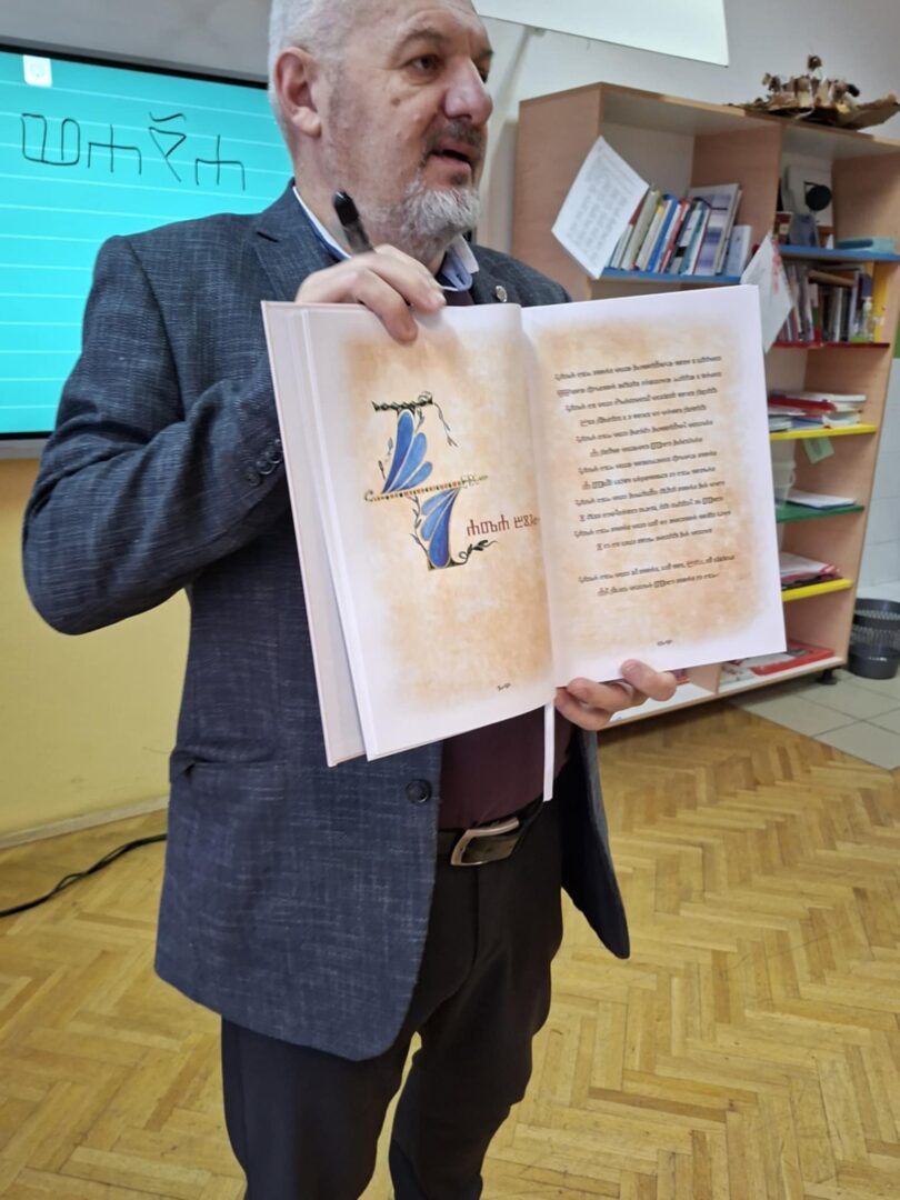 Prošlog tjedna gost naše škole bio je Tomislav Beronić, književnik, glagoljaš, računalni programer, ali prije svega zaljubljenik u glagoljicu. Autor je nekoliko knjiga o glagoljici i na glagoljici („Legende o hrvatskom zmaju”, „Misal kneza Anža Frankopana”, Glagoljica prije Ćirila i Metoda i dr.), tvorac digitalne igre GlagoMatike, videoigre prepoznavanja i zbrajanja brojeva na glagoljici, a koja je od 2021. godine postala prvo matematičko natjecanje u znanju i prepoznavanju glagoljskih brojeva . Objavio je Misal kneza Anža Frankopana-prvi roman ikad otisnut glagoljicom nakon više od 118 godina.